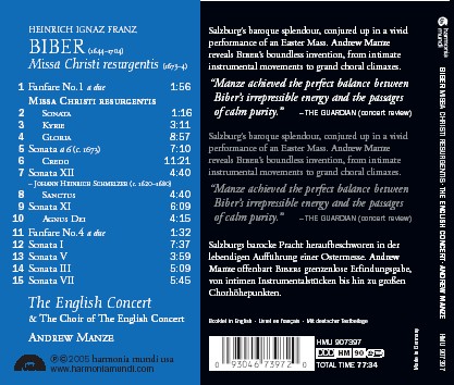 During the summer and autumn of 2004the tercentenary of Biber’s death in Salzburgthe English Concert and Andrew Manze performed the Missa Christi resurgentis in France, Belgium, Holland, Spain and the UK. [1] The concerts received critical acclaim everywhere, and now they have issued their eagerly awaited recording of the massindeed, the first ever recordingwith Harmonia Mundi USA, and it lives up to all expectations. Containing a generous 77.34 minutes of recorded sound, including the mass and a variety of instrumental pieces by Biber (and one by his younger contemporary Heinrich Schmelzer) interspersed between the movements of the mass as was customary in services in late seventeenth century Salzburg Cathedral.